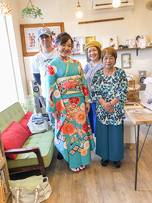 ターコイズ色の個性的な着物なので